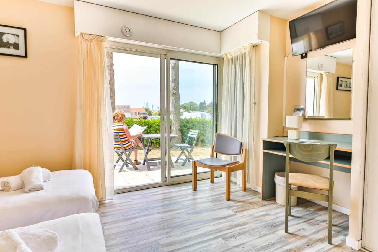 La détente et le repos sont des composantes essentielles pour des vacances réussies. C’est pourquoi nous vous accueillons à Saint-Jean-de-Monts en Vendée dans un club de vacances à taille humaine avec des chambres confortables. Réparties entre deux espaces, « Le Logis » et « Le Patio », chaque chambre dispose d’une salle de bain privative avec douche et d’une télévision. Le wifi est disponible gratuitement dans toute l’enceinte du village club. Au sein de chaque espace, certaines chambres sont à l’étage, accessibles par ascenseur. Selon vos besoins, nous disposons de 3 types de chambres.